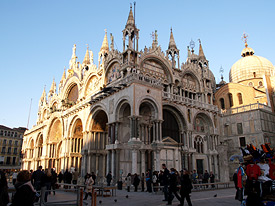 | ヴェネツィアのシンボル、サン・マルコ広場の主。エジプトのアレクサンドリアで殉教してこの地に運ばれた、聖マルコの遺体を祀るために創建(829年)された教会で、現在の建物は11世紀のもの。東方貿易の拠点に相応しいロマネスク・ヴィザンチン様式の建物となっています。 | ||||||||||||||||||